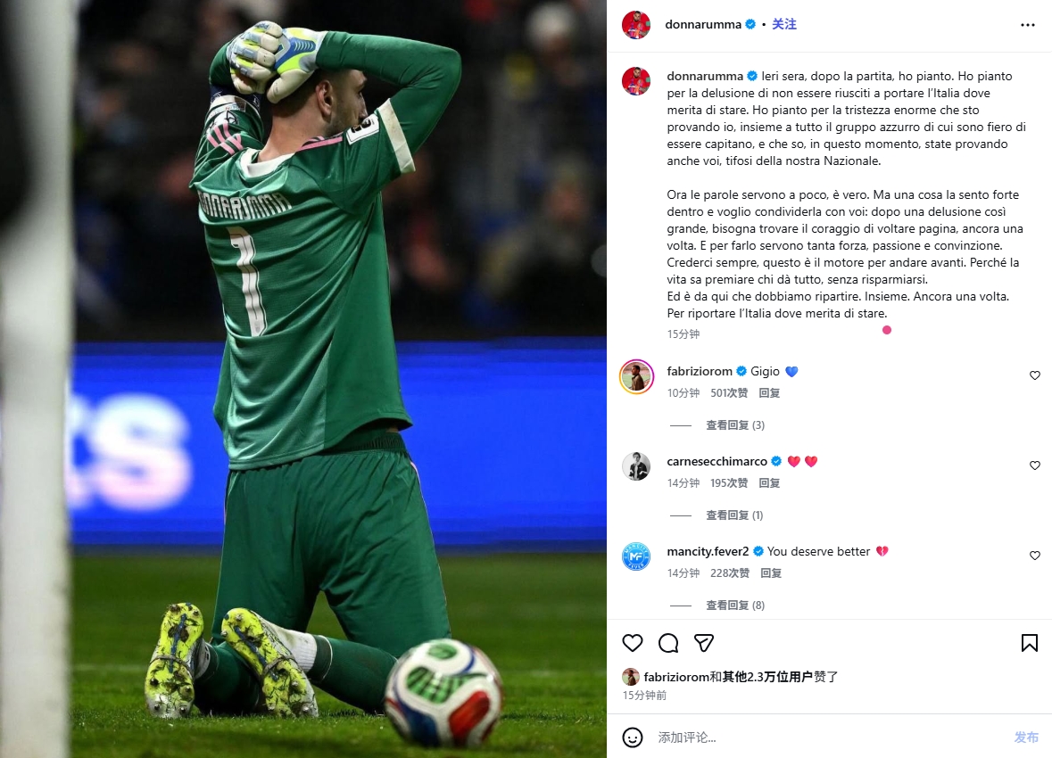 多纳鲁马写道:昨晚赛后,我哭了。我为我们未能带领意大利去到它应得的高度而哭泣,为此刻正席卷我和整个蓝衣军团的巨大悲伤而哭泣,我为自己是这支球队的队长而骄傲,我知道此刻所有国家队的球迷也正经历着同样的痛苦。